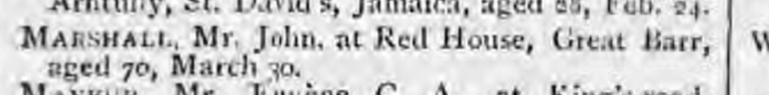John Marshall was the son of William Marshall, resident at Bescott Hall. More information can be found here about John Marshall and his family.