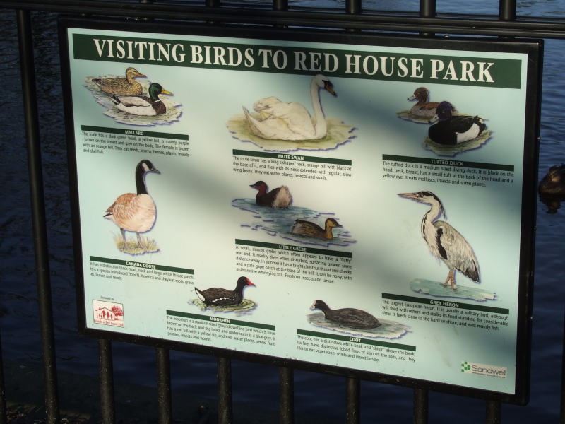 The two ponds are home to a range of water birds. A sign near the lower pond provides some information for visitors about the Mallard, Mute Swan, Tufted Duck, Canada Goose, Little Grebe, Grey Heron, Moorhen and Coot.