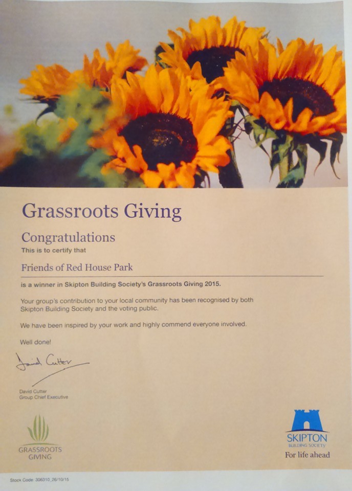 The Friends of Red House Park were successful in their application for the £500 being offered under the Skipton Building Society Grassroots scheme. There was some tough competition where hundreds applied and over 30,000 votes were cast . The Friends were able to demonstrate the work they do and to everyone that voted for them they are extremely grateful