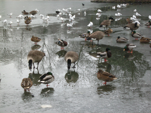 The two ponds are home to a range of water birds. A sign near the lower pond provides some information for visitors about the Mallard, Mute Swan, Tufted Duck, Canada Goose, Little Grebe, Grey Heron, Moorhen and Coot.